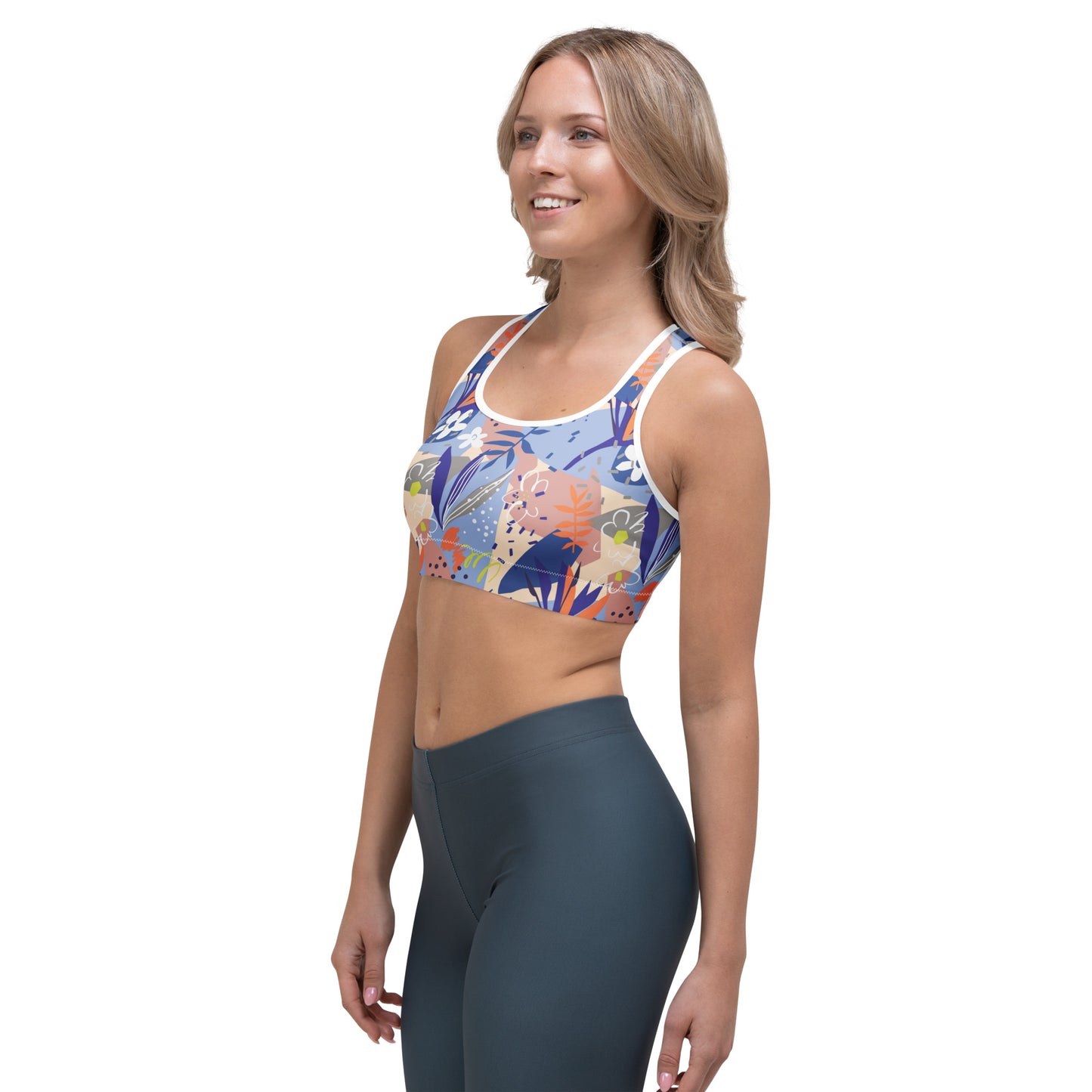 This gorgeous sports bra is made from moisture-wicking material that stays dry during low and medium intensity workouts. The bra has support material in the shoulder straps, double layer front, and a wide elastic band to ensure constant support.